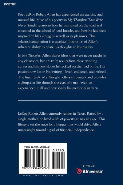 Poet LeRoy Robert Allen has experienced an exciting and unusual life. Most of his poetry in My Thoughts: That Were Never Taught relates to how he was raised on the road and educated in the school of hard knocks, and how he has been inspired by life's struggles as well as its pleasures. This selected compilation is a succinct illustration of Allen's inherent ability to relate his thoughts to his readers. In My Thoughts, Allen shares ideas that were never taught in any classroom, but are truly results from those winding curves and slippery slopes he tackled on the road of life. His passion now lies in his writing-lived, collected, and refined. The final result, My Thoughts, offers enjoyment and provides a glimpse at life through the eyes of a man who has experienced it all and now shares his memories in verse.