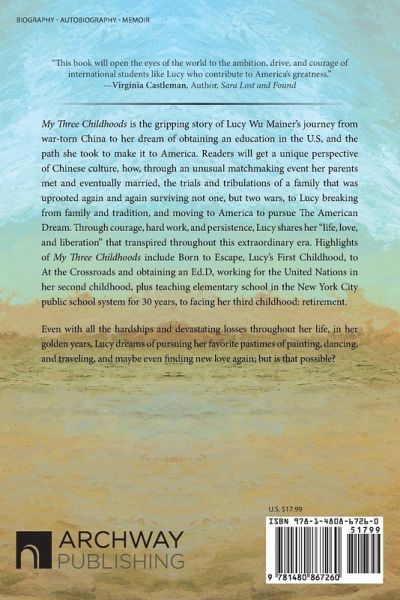 My Three Childhoods takes readers on a journey of Lucy Wu Mainer's riveting, one-of-a-kind experience that included her having to face adult responsibilities at a very young age, complete a challenging education while being torn from home to home, making it to America, facing language and school challenges, and eventually making it to retirement and recapturing the childhood she never had. Lucy says studying hard, working hard, and playing hard, while maintaining a positive attitude, is what helped her survive her harrowing childhood experiences. "I was born to escape the Japanese invasion of China," Lucy says of her life. She and her family were forced to leave their beloved home and resettle in many cities in China, Vietnam, and Burma, always one step ahead of the atrocities of not one, but two wars. Through a strict upbringing, Lucy reveals her inner sense of justice, fairness and distinguishing right from wrong. Like a bird, predestined to fly, Lucy yearned for independence. In America, she worked for years at the United Nations, where she met some very influential and famous people. She received an Ed.D in the United States and taught for 30 years in the New York City public school system. She studied painting at the Art Student League in New York City under John Howard Sandon, Mario Cooper, and Edgar Whitney and others. Her paintings were shown at eight solo exhibits throughout New York and Staten Island. Lucy received many awards for her paintings in group exhibits. In My Three Childhood, Lucy shares the secret ingredient needed to overcome hardship, find passion, and overcome challenges. Retirement permits Lucy to brag about her age, for deep down she has kept a young-at-heart attitude throughout life, never allowing herself to believe that she's "too old" or frail to try anything new. "This book will open the eyes of the world to the ambition, drive, and courage of international students like Lucy who contribute to America's greatness." -Virginia Castleman, Author, Sara Lost and Found