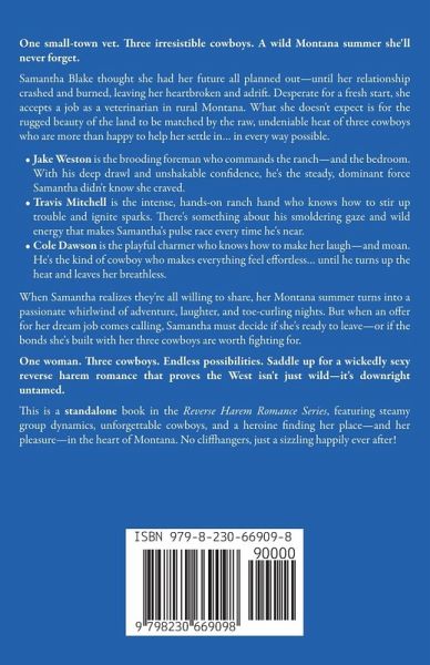 One small-town vet. Three irresistible cowboys. A wild Montana summer she'll never forget. Samantha Blake thought she had her future all planned out-until her relationship crashed and burned, leaving her heartbroken and adrift. Desperate for a fresh start, she accepts a job as a veterinarian in rural Montana. What she doesn't expect is for the rugged beauty of the land to be matched by the raw, undeniable heat of three cowboys who are more than happy to help her settle in... in every way possible.Jake Weston is the brooding foreman who commands the ranch-and the bedroom. With his deep drawl and unshakable confidence, he's the steady, dominant force Samantha didn't know she craved. Travis Mitchell is the intense, hands-on ranch hand who knows how to stir up trouble and ignite sparks. There's something about his smoldering gaze and wild energy that makes Samantha's pulse race every time he's near. Cole Dawson is the playful charmer who knows how to make her laugh-and moan. He's the kind of cowboy who makes everything feel effortless... until he turns up the heat and leaves her breathless. When Samantha realizes they're all willing to share, her Montana summer turns into a passionate whirlwind of adventure, laughter, and toe-curling nights. But when an offer for her dream job comes calling, Samantha must decide if she's ready to leave-or if the bonds she's built with her three cowboys are worth fighting for. One woman. Three cowboys. Endless possibilities. Saddle up for a wickedly sexy reverse harem romance that proves the West isn't just wild-it's downright untamed. This is a standalone book in the Reverse Harem Romance Series, featuring steamy group dynamics, unforgettable cowboys, and a heroine finding her place-and her pleasure-in the heart of Montana. No cliffhangers, just a sizzling happily ever after!