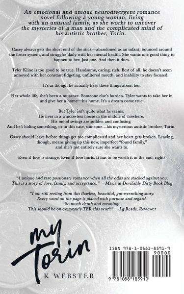 "Although Torin is the one who struggles to communicate, I was the one left speechless by this daring, delicate, and ultimately unforgettable love story." - BB Easton, author of 44 Chapters About 4 Men, the inspiration for Sex/Life on Netflix An emotional and unique neurodivergent romance novel following a young woman, living with an unusual family, as she works to uncover the mysteries of a man and the complicated mind of his autistic brother, Torin. Casey always gets the short end of the stick-abandoned as an infant, bounced around the foster system, and struggles daily with her mental health. She wants one good thing to happen to her. Just one. And then it does. Tyler Kline is too good to be true. Handsome, caring, rich. Best of all, he doesn't seem annoyed with her constant fidgeting, unfiltered mouth, and inability to stay focused. It's as though he actually likes these things about her. Her whole life, she's been a nuisance. Someone else's burden. Tyler wants to take her in and give her a home-his home. It's a dream come true. But Tyler isn't quite what he seems. He lives in a windowless house in the middle of nowhere. His mood swings are sudden and confusing. And he's hiding something, or in this case, someone...his mysterious autistic brother, Torin. Casey should leave before things get too complicated and her heart gets broken. Leaving, though, means giving up this new, imperfect "found family," and she's not entirely sure she wants to. Even if love is strange. Even if love hurts. It has to be worth it in the end, right? Your next emotional, mind-blowing read on love, loss, and unlocking answers to mental health. Casey is a strong heroine who finds a happily ever after in the most unusual way. "A unique and rare passionate romance when all the odds are stacked against you. This is a story of love, family, and acceptance." - Maria at Devilishly Dirty Book Blog "I am still reeling from this flawless, beautiful, gut-wrenching story. Every word on the page is placed with purpose and regard. So much depth and meaning. This should be on everyone's TBR this year!!" - Lg Reads, Reviewer