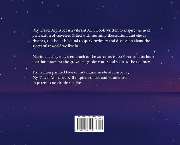 My Travel Alphabet is a vibrant ABC Book written to inspire the next generation of travelers. Filled with stunning illustrations and clever rhymes, this book is bound to spark curiosity and discussion about the spectacular world we live in. Magical as they may seem, each of the 26 scenes is 100% real and includes location notes for the grown-up globetrotter and soon-to-be explorer.