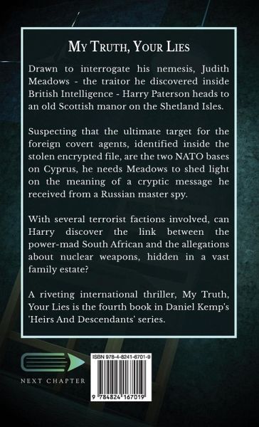 Drawn to interrogate his nemesis, Judith Meadows - the traitor he discovered inside British Intelligence - Harry Paterson heads to an old Scottish manor on the Shetland Isles. Suspecting that the ultimate target for the foreign covert agents, identified inside the stolen encrypted file, are the two NATO bases on Cyprus, he needs Meadows to shed light on the meaning of a cryptic message he received from a Russian master spy. With several terrorist factions involved, can Harry discover the link between the power-mad South African and the allegations about nuclear weapons, hidden in a vast family estate? A riveting international thriller, My Truth, Your Lies is the fourth book in Daniel Kemp's 'Heirs And Descendants' series.