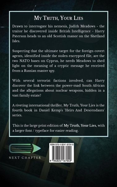 Drawn to interrogate his nemesis, Judith Meadows - the traitor he discovered inside British Intelligence - Harry Paterson heads to an old Scottish manor on the Shetland Isles. Suspecting that the ultimate target for the foreign covert agents, identified inside the stolen encrypted file, are the two NATO bases on Cyprus, he needs Meadows to shed light on the meaning of a cryptic message he received from a Russian master spy. With several terrorist factions involved, can Harry discover the link between the power-mad South African and the allegations about nuclear weapons, hidden in a vast family estate? A riveting international thriller, My Truth, Your Lies is the fourth book in Daniel Kemp's 'Heirs And Descendants' series. This is the large print edition of My Truth, Your Lies, with a larger font / typeface for easier reading.
