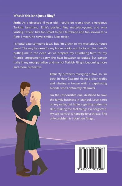 Janie: As a divorced 41-year-old, I could do worse than a gorgeous Turkish farmhand. Emir's perfect fling material-young and only visiting. Except, he's too smart to be a farmhand and too serious for a fling. I mean, he never smiles. Like, never. I should date someone local, but I'm drawn to my mysterious house guest. The way he cares for my horse, cooks, and looks out for me-it's pulling me in too deep. As we prepare my crumbling farm for my friend's engagement party, the heat between us turns into fire. But danger lurks in my rural paradise, and my hot Turkish Fling is becoming more and more protective. Emir: My brother's marrying a Kiwi, so I'm back in New Zealand, fixing broken fences and sharing a house with a captivating blonde who's definitely off-limits. I'm the responsible one, destined to save the family business in Istanbul. Love is not on my radar, but Janie is getting under my skin, making me feel things I've forgotten. My self-control is hanging by a thread. The only problem is, I don't do flings...