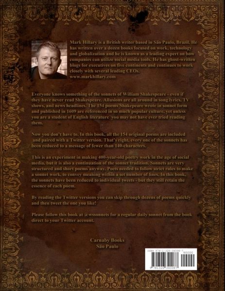 Everyone knows something of the sonnets of William Shakespeare - even if they have never read Shakespeare. Allusions are all around in song lyrics, TV shows, and news headlines. The 154 poems Shakespeare wrote in sonnet form and published in 1609 are referenced in so much popular culture, yet unless you are a student of English literature you may not have ever tried reading them. Now you don't have to. In this book, all the 154 original poems are included and paired with a Twitter version. That's right, every one of the sonnets has been reduced to a message of fewer than 140-characters. This is an experiment in making 400-year-old poetry work in the age of social media, but it is also a continuation of the sonnet traditions. Sonnets are very structured, short poems anyway. Poets needed to follow strict rules to make a sonnet work, to convey meaning within a set number of lines. In this book, the sonnets have been reduced to individual tweets - but they still retain the essence of each poem.