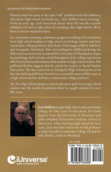 Printed under his name in the class "will" published with his Salisbury, Maryland, high school yearbook was, "Jack Shilkret leaves running." From an early age, Jack fantasized about what life was like outside Salisbury. He had no idea where he would go after high school. All he knew is that he wanted to leave. In a sometimes amusing, sometimes poignant retelling of his transition from high school student to high school psychology teacher and then community college professor, Jack shares vivid images of life in Salisbury and Annapolis, Maryland. After chronicling his childhood during the fifties and eventual move to attend the University of Maryland to major in psychology. Jack includes a brief description of his college experiences which led to his transformation from student to high school teacher. His girlfriend Ruthie suggests that he switch his majors to Social Studies Education. The hire interview at Annapolis High School prove to be that the defining half hour that led to a successful career of fifty years as a high school teacher and later a community college professor. My Two High Schools details a retired educator's path from high school student into the world of academia where he taught students for over fifty years.