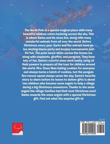 The North Pole is a special magical place with many beautiful rainbow colors beaming across the sky. This is where Santa and his elves live, along with many wonderful animals from all over the world. Before Christmas every year, Santa and the animals have an ice-skating-dance party and hockey tournaments just for fun. The polar bears skate across the frozen ice along with elephants, giraffes, and penguins. They have lots of fun. Santa's colorful elves work busily, using all their powers to prepare all the toys for children around the world. Mrs. Claus likes baking cookies for everyone and always burns a batch of cookies, but the penguin fire-rescue squad always saves the day. Santa's favorite story to share before he leaves to deliver gifts is about two children who became snow angels to help a village during a big Christmas snowstorm. Thanks to the snow angels the village families had their best Christmas ever! Santa rewards the snow angels with a special Christmas gift. Find out what the surprise gift is!