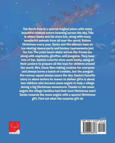 The North Pole is a special magical place with many beautiful rainbow colors beaming across the sky. This is where Santa and his elves live, along with many wonderful animals from all over the world. Before Christmas every year, Santa and the animals have an ice-skating-dance party and hockey tournaments just for fun. The polar bears skate across the frozen ice along with elephants, giraffes, and penguins. They have lots of fun. Santa's colorful elves work busily, using all their powers to prepare all the toys for children around the world. Mrs. Claus likes baking cookies for everyone and always burns a batch of cookies, but the penguin fire-rescue squad always saves the day. Santa's favorite story to share before he leaves to deliver gifts is about two children who became snow angels to help a village during a big Christmas snowstorm. Thanks to the snow angels the village families had their best Christmas ever! Santa rewards the snow angels with a special Christmas gift. Find out what the surprise gift is!