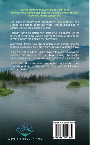 I never thought of myself as dad material. Until my one-night stand showed up in my small Alaskan town five months pregnant. But I don't shy away from responsibility. First, because I'm a Greene and not to boast but we're kind of a big deal in Sunrise Bay. Second, I'm the Sheriff. I couldn't have predicted how protective I'd become for the safety of her and my unborn baby to the point of asking her to move in with me and be my roommate. Just when I think I have the situation under control, another surprise knocks me over, but it only spurs me to double down. I'll be the first to admit, I didn't think it through. Somewhere between the dinners, the TV show binging, the doctor appointments, and me walking in on her naked, lines blurred. In what feels like warp speed, my bachelor for life status is in jeopardy and I'm fighting for the most important thing of all-my family.
