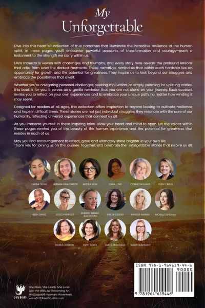 In My Unforgettable: Personal Stories That Will Inspire You, dive into a heartfelt collection of true stories that illuminate the resilience of the human spirit. Each narrative captures life's most profound lessons, reminding us that within every hardship lies the seed of growth and the potential for greatness. Whether you're facing challenges or seeking inspiration, this book serves as a powerful reminder that you are not alone. Each story encourages self-reflection and empowers you to embrace your own journey towards a more fulfilling life. Ideal for readers of all ages, My Unforgettable is a source of motivation for anyone looking to cultivate resilience, find hope in difficult times, or simply be inspired by the incredible stories of others. Let the voices within these pages remind you of the beauty of the human experience and the potential for greatness that lies within us all. Open your heart and mind to the stories that will inspire you to reflect, grow, and shine. Join Adriana Luna Carlos and Hanna Olivas as well as the other 14 inspiring authors on a journey through unforgettable events that have shaped lives and fostered transformation in, My Unforgettable: Personal Stories That Will Inspire You.Jessica Renfeldt Anthea Siow Marissa Warren Krista Sobieski Niurka Coteron Connie Paglianiti Ellen Forbus Michelle Eshelman Susan Heartlight Sonya McDonald Raffy Sgroi Kimberly Mihalik-Blackstone Helen Gaines Ciara Lewis