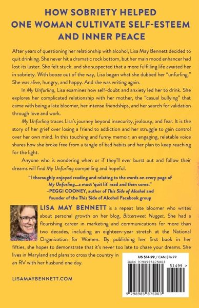 Discover how sobriety helped one woman cultivate self-esteem and inner peace. After years of questioning her relationship with alcohol, Lisa Bennett decided to quit drinking. She never hit a dramatic rock bottom, but her main mood enhancer had lost its luster. She felt stuck, and she suspected that a more fulfilling life awaited her in sobriety. With booze out of the way, Lisa began what she dubbed her "unfurling." She was alive, hungry, and happy. And she was writing again. In My Unfurling, Lisa examines how self-doubt and anxiety led her to drink. She explores her complicated relationship with her mother, the "casual bullying" that came with being a late bloomer, her intense friendships, and her search for validation through love and work. My Unfurling traces Lisa's journey beyond insecurity, jealousy, and fear. It is the story of her grief over losing a friend to addiction and her struggle to gain control over her own mind. In this touching and funny memoir, an engaging, relatable voice shares how she broke free from a tangle of bad habits and her plan to keep reaching for the light. Anyone who is wondering when or if they'll ever burst out and follow their dreams will find My Unfurling compelling and hopeful.