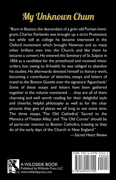 Charles Bullard Fairbanks (1827 - 1859), writing under the pen name Aguecheek, was best known for his collection of sketches and essays known as "My Unknown Chum." The sketches and essays were originally seen in the Boston "Saturday Evening Gazette" as they detailed foreign travels. As the author writes: "The author has endeavoured to avoid the details which he always found tiresome in the works of many foreign tourists, and to confine himself to his individual experience." Contains a Foreword by Henry Garrity.