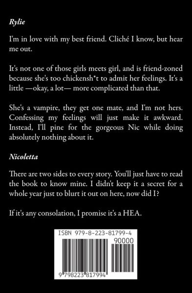 Rylie I'm in love with my best friend. Cliché I know, but hear me out. It's not one of those girls meets girl, and is friend-zoned because she's too chickensh*t to admit her feelings. It's a little -okay, a lot- more complicated than that. She's a vampire, they get one mate, and I'm not hers. Confessing my feelings will just make it awkward. Instead, I'll pine for the gorgeous Nic while doing absolutely nothing about it. Nicoletta There are two sides to every story. You'll just have to read the book to know mine. I didn't keep it a secret for a whole year just to blurt it out on here, now did I? If it's any consolation, I promise it's a HEA.