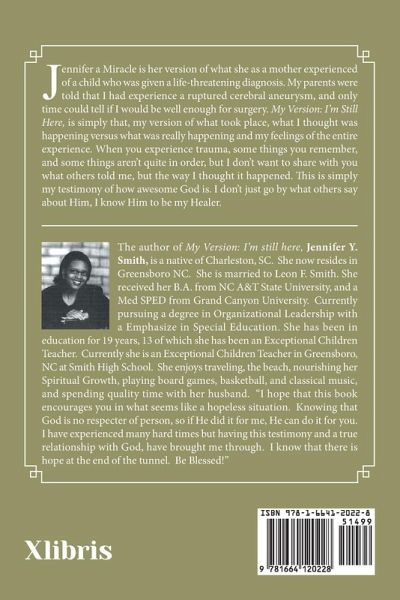 Jennifer a Miracle is her version of what she as a mother experienced of a child who was given a life-threatening diagnosis. My parents were told that I had experience a ruptured cerebral aneurysm, and only time could tell if I would be well enough for surgery. My Version: I'm Still Here, is simply that, my version of what took place, what I thought was happening versus what was really happening and my feelings of the entire experience. When you experience trauma, some things you remember, and some things aren't quite in order, but I don't want to share with you what others told me, but the way I thought it happened. This is simply my testimony of how awesome God is. I don't just go by what others say about Him, I know Him to be my Healer.
