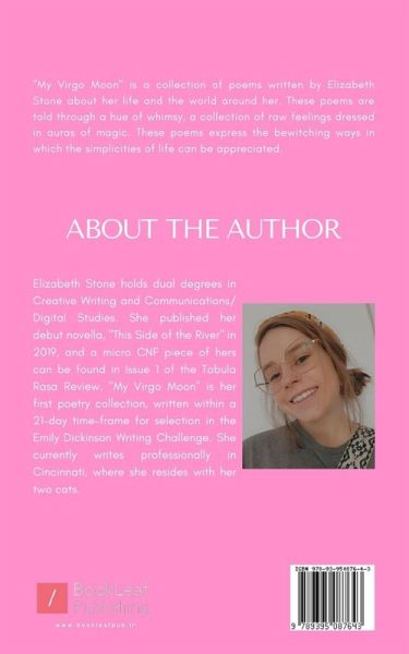 "My Virgo Moon" is a collection of poems written by Elizabeth Stone about her life and the world around her. These poems are told through a hue of whimsy, a collection of raw feelings dressed in auras of magic. These poems express the bewitching ways in which the simplicities of life can be appreciated.
