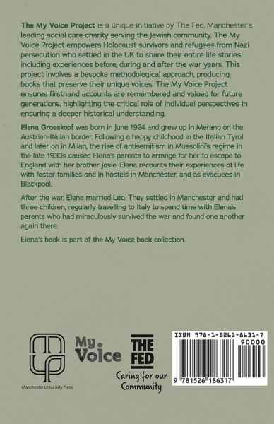 Elena Grosskopf was born in June 1924 and grew up in Merano on the Austrian-Italian border. Following a happy childhood in the Italian Tyrol and later on in Milan, the rise of antisemitism in Mussolini's regime in the late 1930s caused Elena's parents to arrange for her to escape to England with her brother Josie. Elena recounts their experiences of life with foster families and in hostels in Manchester, and as evacuees in Blackpool. After the war, Elena married Leo. They settled in Manchester and had three children, regularly travelling to Italy to spend time with Elena's parents who had miraculously survived the war and found one another again there. Elena's book is part of the My Voice book collection, a stand-alone project of The Fed, the leading Jewish social care charity in Manchester, dedicated to preserving the life stories of Holocaust survivors and refugees from Nazi persecution who settled in the UK. The oral history, which is recorded and transcribed, captures their entire lives from before, during and after the war years. The books are written in the words of the survivor so that future generations can always hear their voice. The My Voice book collection is a valuable resource for Holocaust awareness and education.