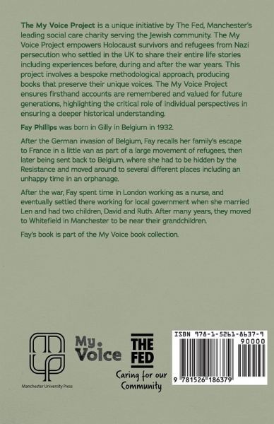 Fay Phillips was born in Gilly in Belgium in 1932. After the German invasion of Belgium, Fay recalls her family's escape to France in a little van as part of a large movement of refugees, then later being sent back to Belgium, where she had to be hidden by the Resistance and moved around to several different places, including an unhappy time in an orphanage. After the war, Fay spent time in London working as a nurse, and eventually settled there working for local government when she married Len and had two children, David and Ruth. After many years, they moved to Whitefield in Manchester to be near their grandchildren. Fay's book is part of the My Voice book collection, a stand-alone project of The Fed, the leading Jewish social care charity in Manchester, dedicated to preserving the life stories of Holocaust survivors and refugees from Nazi persecution who settled in the UK. The oral history, which is recorded and transcribed, captures their entire lives from before, during and after the war years. The books are written in the words of the survivor so that future generations can always hear their voice. The My Voice book collection is a valuable resource for Holocaust awareness and education.