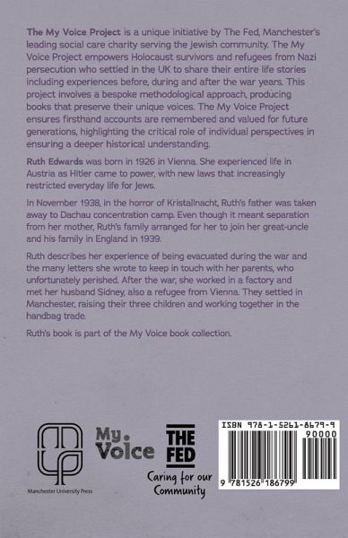 Ruth Edwards was born in 1926 in Vienna. She experienced life in Austria as Hitler came to power, with new laws that increasingly restricted everyday life for Jews. In November 1938, in the horror of Kristallnacht, Ruth's father was taken away to Dachau concentration camp. Even though it meant separation from her mother, Ruth's family arranged for her to join her great-uncle and his family in England in 1939. Ruth describes her experience of being evacuated during the war and the many letters she wrote to keep in touch with her parents, who unfortunately perished. After the war, she worked in a factory and met her husband Sidney, also a refugee from Vienna. They settled in Manchester, raising their three children and working together in the handbag trade. Ruth's book is part of the My Voice book collection, a stand-alone project of The Fed, the leading Jewish social care charity in Manchester, dedicated to preserving the life stories of Holocaust survivors and refugees from Nazi persecution who settled in the UK. The oral history, which is recorded and transcribed, captures their entire lives from before, during and after the war years. The books are written in the words of the survivor so that future generations can always hear their voice. The My Voice book collection is a valuable resource for Holocaust awareness and education.