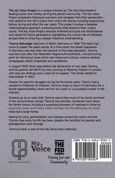 Tommy was born in Berlin, Germany, in 1938, just after Kristallnacht. At that time there were already a lot of restrictions for Jews, and they had to wear a Star of David. In August 1939, three days before the declaration of war, baby Tommy and his parents left Berlin by train, arriving at Waterloo Station, London, with only 10 shillings and a case full of nappies. The family then moved to Manchester in 1943. Despite his parents struggling in the early years, Tommy had a beautiful childhood. At 19, Tommy left Manchester and returned to Germany, having been offered a 3-year apprenticeship, learning all about the textile business in one of the largest mail order companies in Germany. This was just the start of his colourful and successful business career. Growing up as an only child, Tommy learnt that much of his family perished in the concentration camps. Tommy has since discovered he has relatives in America, Argentina, Israel and France. Had it not been for the Holocaust, he would have had a large family. Having his sons, grandchildren, and relatives around the world, reminds Tommy how lucky his life has been, despite the hardship his parents and ancestors went through. Tommy's book is part of the My Voice book collection, a stand-alone project of The Fed, the leading Jewish social care charity in Manchester, dedicated to preserving the life stories of Holocaust survivors and refugees from Nazi persecution who settled in the UK. The oral history, which is recorded and transcribed, captures their entire lives from before, during and after the war years. The books are written in the words of the survivor so that future generations can always hear their voice. The My Voice book collection is a valuable resource for Holocaust awareness and education.
