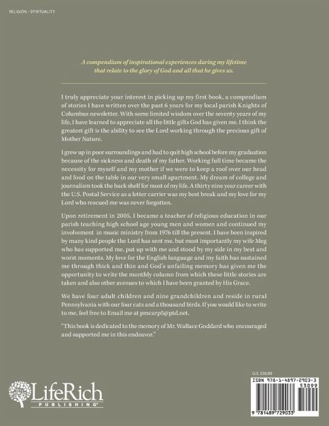 I truly appreciate your interest in picking up my first book, a compendium of stories I have written over the past 6 years for my local parish Knights of Columbus newsletter. With some limited wisdom over the seventy years of my life, I have learned to appreciate all the little gifts God has given me. I think the greatest gift is the ability to see the Lord working through the precious gift of Mother Nature. I grew up in poor surroundings and had to quit high school before my graduation because of the sickness and death of my father. Working full time became the necessity for myself and my mother if we were to keep a roof over our head and food on the table in our very small apartment. My dream of college and journalism took the back shelf for most of my life. A thirty nine year career with the U.S. Postal Service as a letter carrier was my best break and my love for my Lord who rescued me was never forgotten. Upon retirement in 2005, I became a teacher of religious education in our parish teaching high school age young men and women and continued my involvement in music ministry from 1976 till the present. I have been inspired by many kind people the Lord has sent me, but most importantly my wife Meg who has supported me, put up with me and stood by my side in my best and worst moments. My love for the English language and my faith has sustained me through thick and thin and God's unfailing memory has given me the opportunity to write the monthly column from which these little stories are taken and also other avenues to which I have been granted by His Grace. We have four adult children and nine grandchildren and reside in rural Pennsylvania with our four cats and a thousand birds. If you would like to write to me, feel free to Email me at pmcarp5@ptd.net. "This book is dedicated to the memory of Mr. Wallace Goddard who encouraged and supported me in this endeavor."