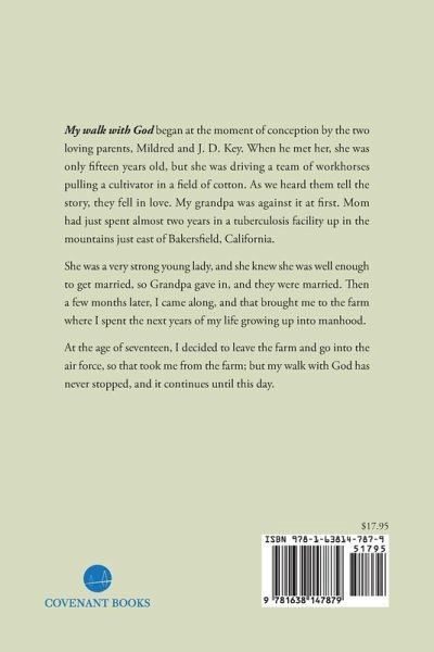My walk with God began at the moment of conception by the two loving parents, Mildred and J. D. Key. When he met her, she was only fifteen years old, but she was driving a team of workhorses pulling a cultivator in a field of cotton. As we heard them tell the story, they fell in love. My grandpa was against it at first. Mom had just spent almost two years in a tuberculosis facility up in the mountains just east of Bakersfield, California. She was a very strong young lady, and she knew she was well enough to get married, so Grandpa gave in, and they were married. Then a few months later, I came along, and that brought me to the farm where I spent the next years of my life growing up into manhood. At the age of seventeen, I decided to leave the farm and go into the air force, so that took me from the farm; but my walk with God has never stopped, and it continues until this day.