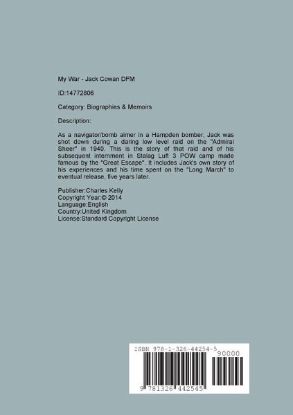 As a navigator/bomb aimer in a Hampden bomber, Jack was shot down during a daring low level raid on the "Admiral Sheer" in 1940. This is the story of that raid and of his subsequent internment in Stalag Luft 3 POW camp made famous by the "Great Escape". It includes Jack's own story of his experiences and his time spent on the "Long March" to eventual release, five years later. All profit from the sale of this publication is being donated directly to the 'Help for Heros' military charity.