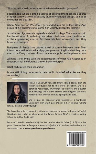 ♥ What would you do when you come face to face with your past? ♥ Social media which is often a source of entertainment can be a source of great sorrow as well. Especially alumni WhatsApp groups, as not all memories are pleasant. When Ajay, now an IAS officer, gets added into his college WhatsApp group, all his classmates welcome him warmly. Except for Jasmine. Jasmine and Ajay were inseparable while in college. Their relationship had transitioned from being best friends to lovers over the duration of the engineering course. But then fate had intervened, and they became estranged. Five years of silence have created a wall of sorrow between them. Their interactions in the class WhatsApp group are nothing like what they once used to be. Every moment churns out more anguish and unpleasantness. Jasmine is still living with the repercussions of what had happened in the past. Ajay's indifference throws her into despair. What had caused their separation? Is love still hiding underneath their public facades? What lies are they concealing?