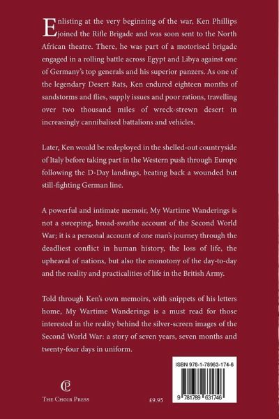 Ken Phillips enlisted at the start of World War 2 and joined the Rifle Brigade. He was sent to North Africa where he was part of an anti-tank division engaged in a rolling battle across Egypt and Libya against one of Germany's top generals and his superior panzers. Ken endured eighteen months of sandstorms and flies, supply issues and poor rations, travelling over two thousand miles of wreck-strewn desert in increasingly cannibalised battalions and vehicles. Later, Ken would be redeployed in the shelled-out countryside of Italy before taking part in the Western push through Europe following the D-Day landings, beating back a wounded but still-fighting German line. A powerful and intimate memoir, My Wartime Wanderings is not a sweeping, broad-swathe account of the Second World War; it is a personal account of one man's journey through the deadliest conflict in human history, the loss of life, the upheaval of nations, but also the monotony of the day-to-day and the reality and practicalities of life in the British Army. Told through Ken's own memoirs, with snippets of his letters home, My Wartime Wanderings is a must read for those interested in the reality behind the silver-screen images of the Second World War: a story of seven years, seven months and twenty-four days in uniform.