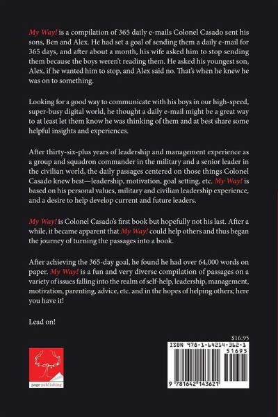 My Way! is a compilation of 365 daily e-mails Colonel Casado sent his sons, Ben and Alex. He had set a goal of sending them a daily e-mail for 365 days, and after about a month, his wife asked him to stop sending them because the boys werent reading them. He asked his youngest son, Alex, if he wanted him to stop, and Alex said no. Thats when he knew he was on to something. Looking for a good way to communicate with his boys in our high-speed, super-busy digital world, he thought a daily e-mail might be a great way to at least let them know he was thinking of them and at best share some helpful insights and experiences. After thirty-six-plus years of leadership and management experience as a group and squadron commander in the military and a senior leader in the civilian world, the daily passages centered on those things Colonel Casado knew bestleadership, motivation, goal setting, etc. My Way! is based on his personal values, military and civilian leadership experience, and a desire to help develop current and future leaders. My Way! is Colonel Casados first book but hopefully not his last. After a while, it became apparent that My Way! could help others and thus began the journey of turning the passages into a book. After achieving the 365-day goal, he found he had over 64,000 words on paper. My Way! is a fun and very diverse compilation of passages on a variety of issues falling into the realm of self-help, leadership, management, motivation, parenting, advice, etc. and in the hopes of helping others; here you have it! Lead on!