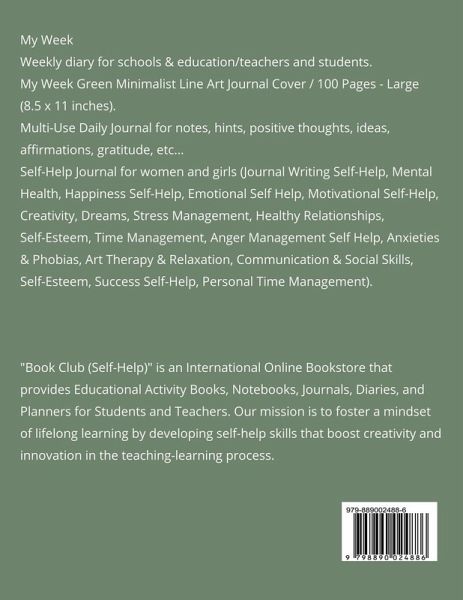 Introducing "My Week" - The Ultimate Journal for Students and Teachers! Stay organized and motivated with the "My Week" Green Minimalist Line Art Journal. Perfect for both students and educators, this journal helps you plan, reflect, and grow. Key Features: Weekly Layout: Track tasks, assignments, and goals for the week. Large Size (8.5 x 11 inches): Plenty of space for notes, ideas, and reflections. 100 Pages: Ideal for a full school year. Minimalist Design: Inspiring green cover with line art for creativity and clarity. Multi-Use: Perfect for affirmations, goals, gratitude, and more. Positive Mindset: Reflect on daily affirmations and things you're grateful for. Perfect for: Students: Stay on top of assignments and goals. Teachers: Organize lesson plans and important notes. Anyone: Ideal for creativity, reflection, and organization. Gift Idea: A thoughtful gift for students, teachers, or anyone who loves journaling!