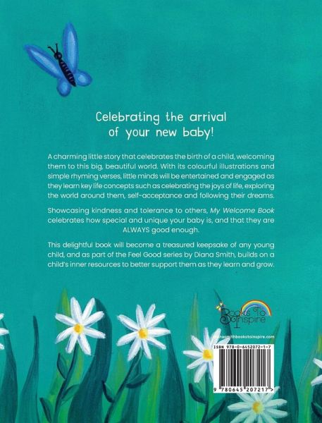 **GOLD WINNER OF THE LITERARY TITAN BOOK AWARDS** Celebrating the arrival of a new baby A charming little story that celebrates the birth of a child, welcoming them to this big, beautiful world. With its colourful illustrations and simple rhyming verses, little minds will be entertained and engaged as they learn key life concepts such as celebrating the joys of life, exploring the world around them, self-acceptance and following their dreams. Showcasing kindness and tolerance to others, My Welcome Book celebrates how special and unique your baby is, and that they are ALWAYS good enough. Inclusive, vibrant and uplifting My Welcome Book improves a child's ability to problem solve, increase mental resilience and have an understanding of the importance of appreciating the diversity around them. This delightful book will become a treasured keepsake of any young child, and as part of the Feel Good series by Diana Smith, builds on a child's inner resources to better support them as they learn and grow. With space for you to write the child's name in the front of this book, it is a wonderful keepsake and makes the perfect gift for baby showers and newborn presents.