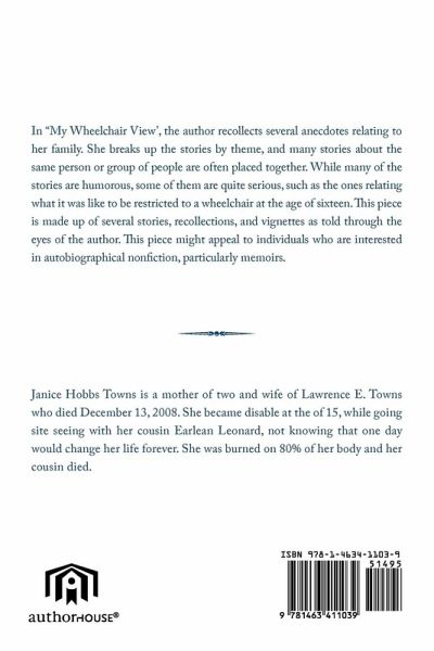 In "My Wheelchair View', the author recollects several anecdotes relating to her family. She breaks up the stories by theme, and many stories about the same person or group of people are often placed together. While many of the stories are humorous, some of them are quite serious, such as the ones relating what it was like to be restricted to a wheelchair at the age of sixteen. This piece is made up of several stories, recollections, and vignettes as told through the eyes of the author. This piece might appeal to individuals who are interested in autobiographical nonfiction, particularly memoirs.