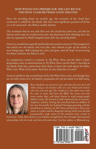 HOW WOULD YOU PREPARE FOR THE LAST BATTLE, THE FINAL CLASH BETWEEN GOOD AND EVIL? Since the unveiling battle six months ago, the mysteries of the cloud have continued to unfold for the family. But their most significant question of all has yet to be answered-the Rider's earthly identity. The revelation that he not only flew over the clouds but earth too, and that he had an earth-name he would reveal soon, has dominated their thinking since the time he appeared in Mark's hospital room after the unveiling battle. However, months have gone by and his identity remains a mystery. Discouragement has settled over the family, and even Jake, who refused to give up his search, is now losing hope. Bob's passing has come and gone, and the hope of uncovering the Rider's identity has faded as well. As complacency turned to curiosity in My White Horse and the Rider's Cloud, desperation turns to determination in My White Horse and the Rider's Unveiling as the family finds they cannot bury their desire to know the truth about the Rider. Who is he? What is his name? And how do they find him on earth? Answers unfold in this second book of the My White Horse series, and though they are not fully aware of it, the family's preparation for the last battle is in full swing. Rose Murdock was seventeen years old when she met the Lord while sitting at the kitchen table of a new friend and mentor who was twice her age. She would sit at this table every week for years to come and learn the Bible. For many years she wrote stories, skits, and object lessons to teach young people biblical truths. She learned to find a balanced mix of accuracy, simplicity, and fun. During this time Rose had two children of her own. Eventually, her husband Tim began pastoring, and she joined him in ministry. In 2021 Rose retired from a thirty-year career as a police and fire dispatcher during which time she had encountered a wide variety of life situations from critical to humorous. Today, Rose desires to see families strengthened. First through their personal relationships with the Lord, and then with each other. Visit her website at Bibleseed.org.