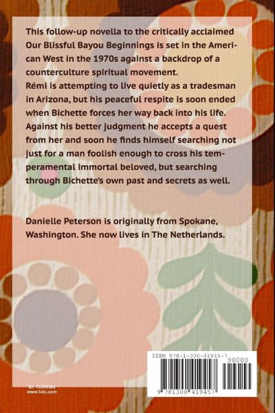 This follow-up novella to the critically acclaimed Our Blissful Bayou Beginnings is set in the American West in the 1970s against a backdrop of a counterculture spiritual movement. Rémi is attempting to live quietly as a tradesman in Arizona, but his peaceful respite is soon ended when Bichette forces her way back into his life. Against his better judgment he accepts a quest from her and soon he finds himself searching not just for a man foolish enough to cross his temperamental immortal beloved, but searching through Bichette's own past and secrets as well.