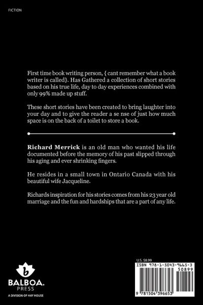 The author is a first-time book-writing person (he cant remember what a book writer is called). He has gathered a collection of short stories based on his true life and day-to-day experiences combined with only 99 percent made-up stuff. These short stories have been created to bring laughter into your day and to give the reader a sense of just how much space is on the back of a toilet to store a book.