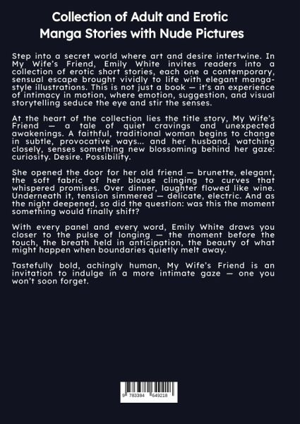 Step into a secret world where art and desire intertwine. In My Wife's Friend, Emily White invites readers into a collection of erotic short stories, each one a contemporary, sensual escape brought vividly to life with elegant manga-style illustrations. This is not just a book - it's an experience of intimacy in motion, where emotion, suggestion, and visual storytelling seduce the eye and stir the senses.At the heart of the collection lies the title story, My Wife's Friend - a tale of quiet cravings and unexpected awakenings. A faithful, traditional woman begins to change in subtle, provocative ways... and her husband, watching closely, senses something new blossoming behind her gaze: curiosity. Desire. Possibility.She opened the door for her old friend - brunette, elegant, the soft fabric of her blouse clinging to curves that whispered promises. Over dinner, laughter flowed like wine. Underneath it, tension simmered - delicate, electric. And as the night deepened, so did the question: was this the moment something would finally shift?With every panel and every word, Emily White draws you closer to the pulse of longing - the moment before the touch, the breath held in anticipation, the beauty of what might happen when boundaries quietly melt away.Tastefully bold, achingly human, My Wife's Friend is an invitation to indulge in a more intimate gaze - one you won't soon forget.