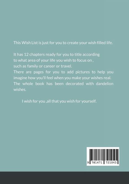 Your Wish List has been created to enable you to consider what you wish for the different areas in your life .It has been divided ,with dandelion drawings, into 12 sections.Each section has a title page,where you can write the area of life ,such as family ,health (emotional and physical) ,career or travel ,spirituality or your ideal home .Its up to you to choose the title of each chapter ,as it is your wish list.Consideration has been given to pages for the addition of magazine cuttings or photos to inspire your wishes and encourage your imagination.It is a book for the young, or young at heart.Designed for those who know wishes can come true.