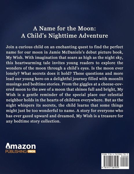 Join a curious child on an enchanting quest to find the perfect name for our moon in Jamie McDaniels's debut picture book, My Wish. With imagination that soars as high as the night sky, this heartwarming tale invites young readers to explore the wonders of the moon through a child's eyes. Is the moon ever lonely? What secrets does it hold? These questions ad more lead our young hero on a delightful journey filled with moonlit musings and bedtime stories. From the giggles of a cheese-covered moon to the awe of a moon that shines full and bright, My Wish is a gentle reminder of the special place our celestial neighbor holds in the hearts of children everywhere. But as the night whispers its secrets, the child learns that some things might just be too wonderful to name. A story for everyone who has ever gazed upward and dreamed, My Wish is a treasure for any bedtime story collection.