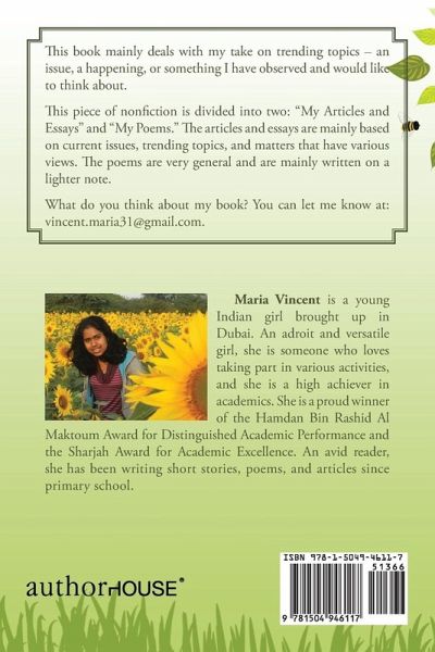 This book mainly deals with my take on trending topics - an issue, a happening, or something I have observed and would like to think about. This piece of nonfiction is divided into two: "My Articles and Essays" and "My Poems." The articles and essays are mainly based on current issues, trending topics, and matters that have various views. The poems are very general and are mainly written on a lighter note. What do you think about my book? You can let me know at: vincent.maria31@gmail.com.