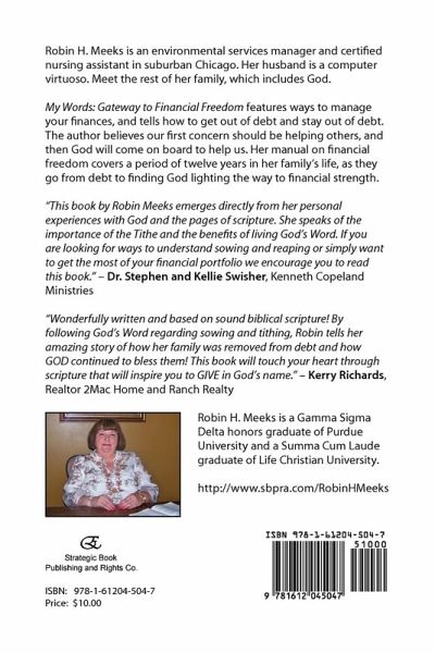 Robin H. Meeks is an environmental services manager and certified nursing assistant in suburban Chicago. Her husband is a computer virtuoso. Meet the rest of her family, which includes God. My Words: Gateway to Financial Freedom features ways to manage your finances, and tells how to get out of debt and stay out of debt. The author believes our first concern should be helping others, and then God will come on board to help us. Her manual on financial freedom covers a period of twelve years in her family's life, as they go from debt to finding God lighting the way to financial strength. "This book by Robin Meeks emerges directly from her personal experiences with God and the pages of scripture. She speaks of the importance of the Tithe and the benefits of living God's Word. If you are looking for ways to understand sowing and reaping or simply want to get the most of your financial portfolio we encourage you to read this book." - Dr. Stephen and Kellie Swisher, Kenneth Copeland Ministries "Wonderfully written and based on sound biblical scripture! By following God's Word regarding sowing and tithing, Robin tells her amazing story of how her family was removed from debt and how GOD continued to bless them! This book will touch your heart through scripture that will inspire you to GIVE in God's name." - Kerry Richards, Realtor 2Mac Home and Ranch Realty About the Author: Robin H. Meeks is a Gamma Sigma Delta honors graduate of Purdue University and a Summa Cum Laude graduate of Life Christian University. Publisher's website: http://www.sbpra.com/RobinHMeeks