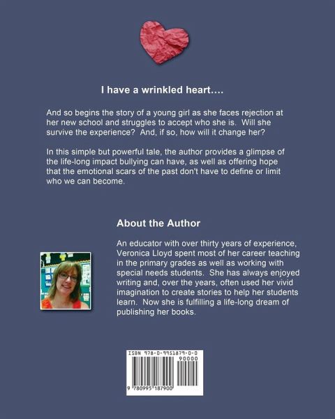 I have a wrinkled heart... And so begins the story of a young girl as she faces rejection at her new school and struggles to accept who she is. Will she survive the experience? And, if so, how will it change her? In this simple but powerful tale, the author provides a glimpse of the life-long impact bullying can have, as well as offering hope that the emotional scars of the past don't have to define or limit who we can become.