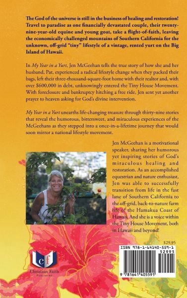 The God of the universe is still in the business of healing and restoration. Travel to paradise as one financially devastated couple, their twenty-nine-year-old equine, and young goat take a flight-of- faith, leaving the economically challenged mountains of Southern California for the unknown, off- grid "tiny" lifestyle of a vintage, rented yurt on the Big Island of Hawaii. In My Year in a Yurt, Jen McGeehan tells the true story of how she and her husband, Pat, experienced a radical lifestyle change when they packed their bags, left their three-thousand-square- foot home with their realtor and, with over $600,000 in debt, unknowingly entered the Tiny House Movement. With foreclosure and bankruptcy hitching a free ride, Jen sent yet another prayer to heaven asking for God's divine intervention. My Year in a Yurt unearths life-changing treasure through thirty-eight stories that reveal the humorous, bittersweet, and miraculous experiences of the McGeehans as they stepped into a once-in-a-lifetime journey that would soon mirror a national lifestyle movement. Jen McGeehan is a motivational speaker, sharing her humorous yet inspiring stories of God's miraculous healing and restoration. As an accomplished equestrian and nature enthusiast, Jen was able to successfully transition from life in the fast lane of Southern California to the off-grid, back-to-nature farm life of the Hamakua Coast of Hawaii. She is the founder of the Annual Christian Women's Gathering, currently held on the Big Island of Hawaii. "And she is a" voice within the Tiny House Movement, both in Hawaii and beyond!