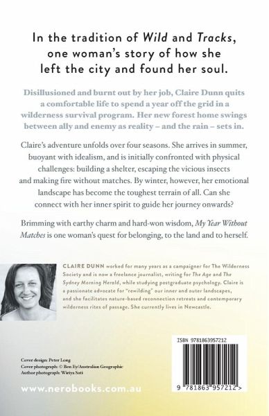 In the tradition of Wild and Tracks, one woman's story of how she left the city and found her soul. Disillusioned and burnt out by her job, Claire Dunn quits a comfortable life to spend a year off the grid in a wilderness survival program. Her new forest home swings between ally and enemy as reality - and the rain - sets in. Claire's adventure unfolds over four seasons and in the essential order of survival: shelter, water, fire and food. She arrives in summer, buoyant with idealism, and is initially confronted with physical challenges: building a shelter, escaping the vicious insects and making fire without matches. By winter, however, her emotional landscape has become the toughest terrain of all. Can she connect with her inner spirit to guide her journey onwards? Brimming with earthy charm and hard-won wisdom, My Year Without Matches is one woman's quest for belonging, to the land and to herself. When Claire finally cracks life in the bush wide open, she discovers a wild heart to warm the coldest night. "A brave and adventurous book ... Claire's writing is full of life and profound surprises." - Anne Deveson "An entertaining look at how Dunn survived for four seasons in a 'hundred acres of baking scrubland" - Sun Herald "With earthy, expressive honesty she shares her struggles [and] the swooping highs of crafting life out of a block of unforgiving scrub... by sharing such an intimate journey, Claire has given us all a gift." - WellBeing Magazine