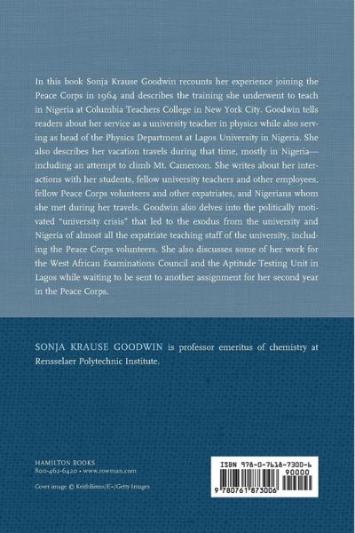 In this book, Sonja Krause Goodwin describes her Peace Corps training for teaching in Nigeria in 1964, her service there as a university teacher in physics, and her vacation travels. She notes her interactions with students, fellow university employees, other Peace Corps volunteers, and Nigerians.