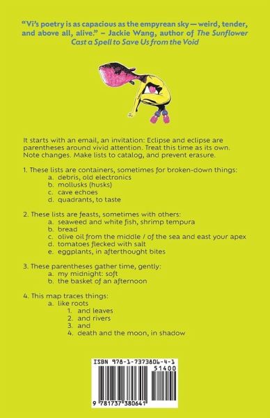 It starts with an email, an invitation: Eclipse and eclipse are parentheses around vivid attention. Treat this time as its own. Note changes. Make lists to catalog, and prevent erasure. 1. These lists are containers, sometimes for broken-down things: a. debris, old electronics b. mollusks (husks) c. cave echoes d. quadrants, to taste 2. These lists are feasts, sometimes with others: a. seaweed and white fish, shrimp tempura b. bread c. olive oil from the middle / of the sea and east your apex d. tomatoes flecked with salt e. eggplants, in afterthought bites 3. These parentheses gather time, gently: a. my midnight: soft b. the basket of an afternoon 4. This map traces things: a. like roots 1. and leaves 2. and rivers 3. and 4. death and the moon, in shadow