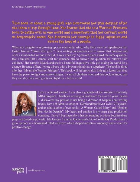 When my daughter was growing up, she constantly asked, why there were no superheroes that looked like her "brown skin girls." I was waiting on someone else to answer that question and offer a solution but no one ever did. It was when my 7-year-old niece asked the same question, that I realized that I cannot wait for someone else to answer that question for "Brown skin children." Her name is Myani, and she is a beautiful, inquisitive little girl asking the world for a change. Because of her, I wrote a book with a brown skin girl as a superhero. The book is titled after her "Myani the Warrior Princess". This book will let brown skin little girls know that they have the power to fight and make changes. I want all children who read this book to know, that they can slay their own giants and fight for a better world.