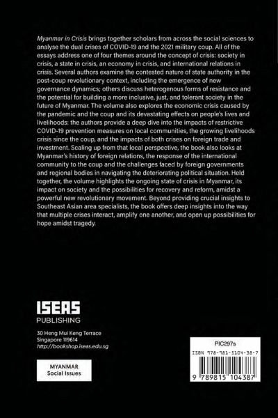 Myanmar in Crisis brings together scholars from across the social sciences to analyse the dual crises of COVID-19 and the 2021 military coup. All of the essays address one of four themes around the concept of crisis: society in crisis, a state in crisis, an economy in crisis, and international relations in crisis. Several authors examine the contested nature of state authority in the post-coup revolutionary context, including the emergence of new governance dynamics; others discuss heterogenous forms of resistance and the potential for building a more inclusive, just, and tolerant society in the future of Myanmar. The volume also explores the economic crisis caused by the pandemic and the coup and its devastating effects on people's lives and livelihoods: the authors provide a deep dive into the impacts of restrictive COVID-19 prevention measures on local communities, the growing livelihoods crisis since the coup, and the impacts of both crises on foreign trade and investment. Scaling up from that local perspective, the book also looks at Myanmar's history of foreign relations, the response of the international community to the coup and the challenges faced by foreign governments and regional bodies in navigating the deteriorating political situation. Held together, the volume highlights the ongoing state of crisis in Myanmar, its impact on society and the possibilities for recovery and reform, amidst a powerful new revolutionary movement. Beyond providing crucial insights to Southeast Asian area specialists, the book offers deep insights into the way that multiple crises interact, amplify one another, and open up possibilities for hope amidst tragedy.