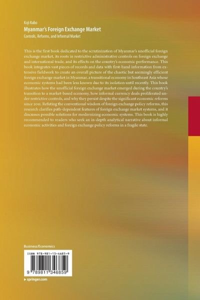 This is the first book dedicated to the scrutinization of Myanmar's unofficial foreign exchange market, its roots in restrictive administrative controls on foreign exchange and international trade, and its effects on the country's economic performance. This book integrates vast pieces of records and data with first-hand information from extensive fieldwork to create an overall picture of the chaotic but seemingly efficient foreign exchange market in Myanmar, a transitional economy in Southeast Asia whose economic systems had been less known due to its isolation until recently. This book illustrates how the unofficial foreign exchange market emerged during the country's transition to a market-based economy, how informal currency deals proliferated under restrictive controls, and why they persist despite the significant economic reforms since 2011. Refuting the conventional wisdom of foreign exchange policy reforms, this research clarifies path-dependent features of foreign exchange market systems, and it discusses possible solutions for modernizing economic systems. This book is highly recommended to readers who seek an in-depth analytical narrative about informal economic activities and foreign exchange policy reforms in a fragile state.