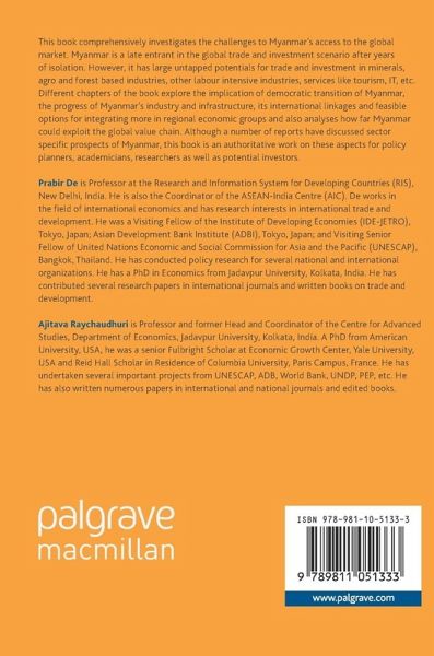 This book comprehensively investigates the challenges to Myanmar's access to the global market. Myanmar is a late entrant in the global trade and investment scenario after years of isolation. However, it has large untapped potentials for trade and investment in minerals, agro and forest based industries, other labour intensive industries, services like tourism, IT, etc. Different chapters of the book explore the implication of democratic transition of Myanmar, the progress of Myanmar's industry and infrastructure, its international linkages and feasible options for integrating more in regional economic groups and also analyses how far Myanmar could exploit the global value chain. Although a number of reports have discussed sector specific prospects of Myanmar, this book is an authoritative work on these aspects for policy planners, academicians, researchers as well as potential investors.