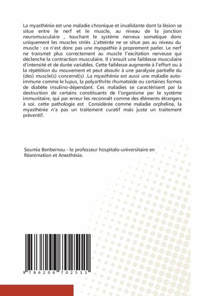 La myasthénie est une maladie chronique et invalidante dont la lésion se situe entre le nerf et le muscle, au niveau de la jonction neuromusculaire , touchant le système nerveux somatique donc uniquement les muscles striés .L'atteinte ne se situe pas au niveau du muscle : ce n'est donc pas une myopathie à proprement parler. Le nerf ne transmet plus correctement au muscle l'excitation nerveuse qui déclenche la contraction musculaire. Il s'ensuit une faiblesse musculaire d'intensité et de durée variables. Cette faiblesse augmente à l'effort ou à la répétition du mouvement et peut aboutir à une paralysie partielle du (des) muscle(s) concerné(s) .La myasthénie est aussi une maladie auto-immune comme le lupus, la polyarthrite rhumatoïde ou certaines formes de diabète insulino-dépendant. Ces maladies se caractérisent par la destruction de certains constituants de l'organisme par le système immunitaire, qui par erreur les reconnaît comme des éléments étrangers à soi. cette pathologie est Considérée comme maladie orpheline, la myasthénie n'a pas un traitement curatif mais juste un traitement préventif.